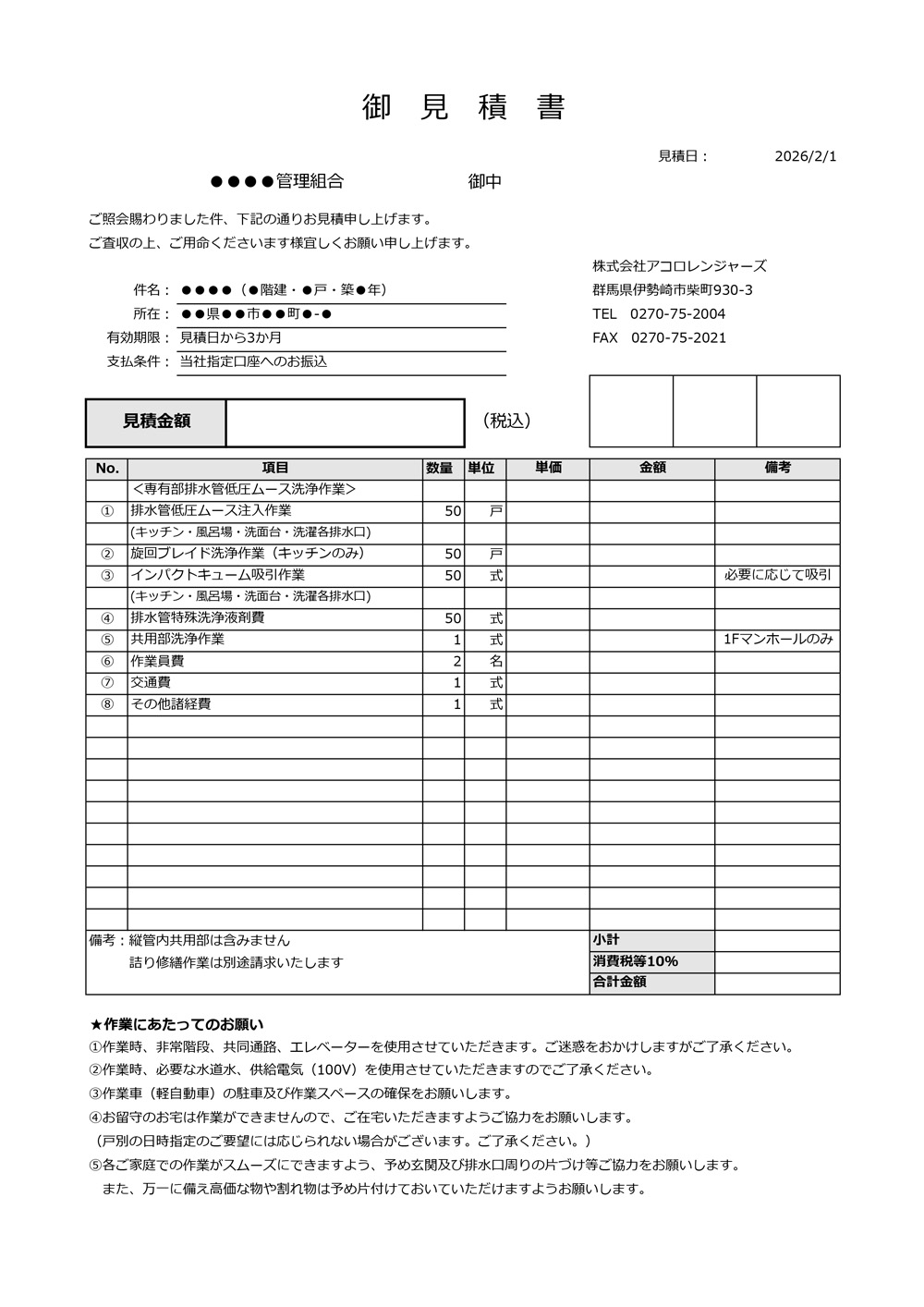 「御建物情報確認表」をお送りします。建物の場所や規模、設備の状況など、作業に必要な基本情報をご記入ください。