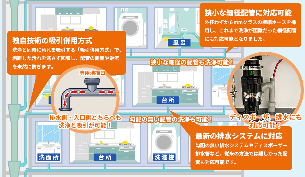 これまで困難だった細径、勾配の無い配管、ディスポーザー排水管にも対応可能 |