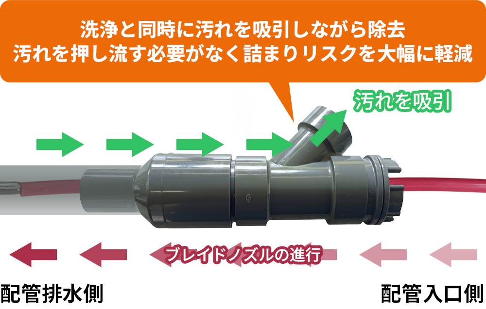 清掃口が中間部にある場合でも、吸引を維持したまま配管の入口側・排水側の両方向にブレイドを伸ばして洗浄できるのが大きな特長です。