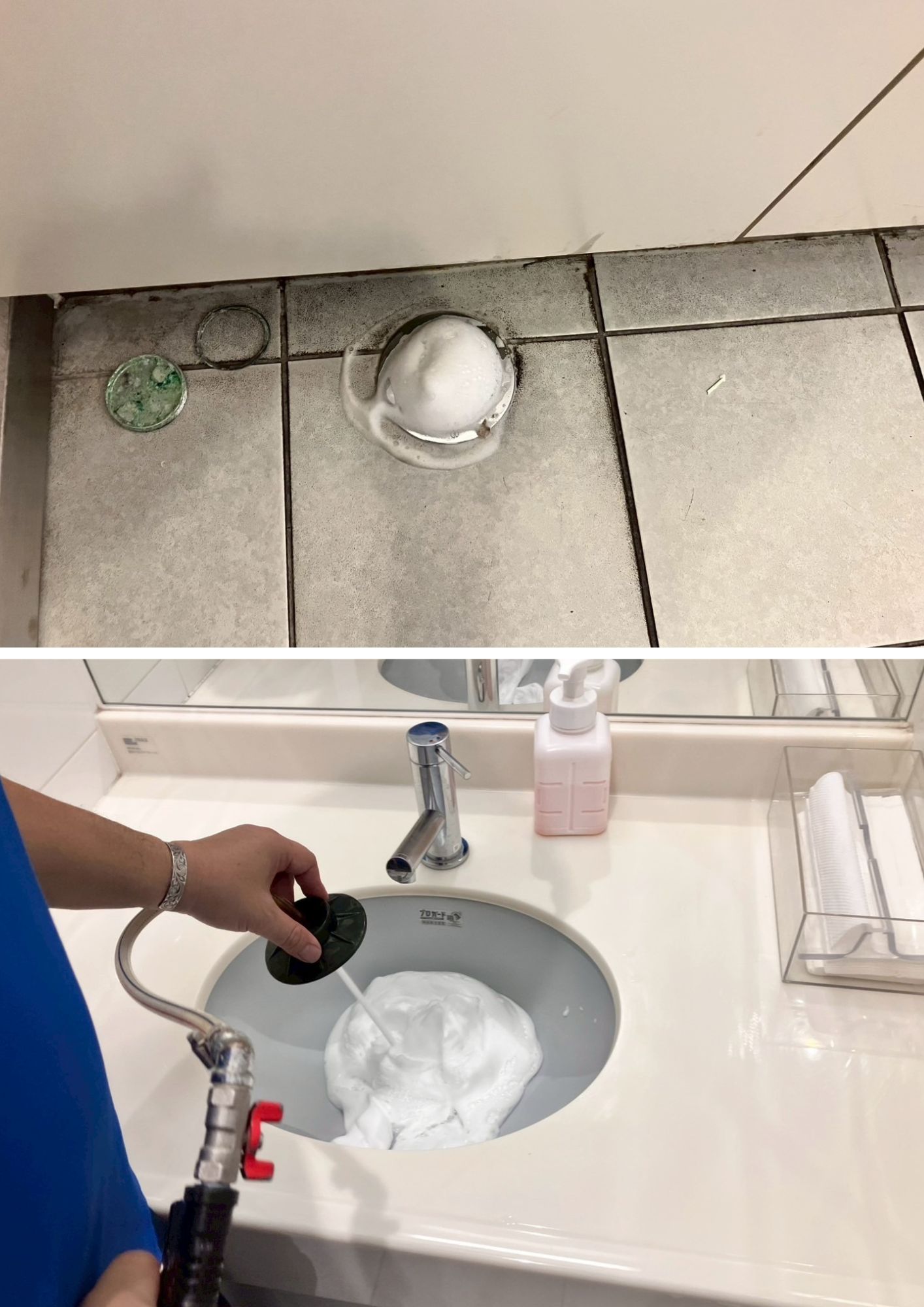 【汚水管】室内・室外『低圧ムース洗浄工法(陰毛)』【汚水管】室内・室外『クリームバスター工法(尿石溶解)』