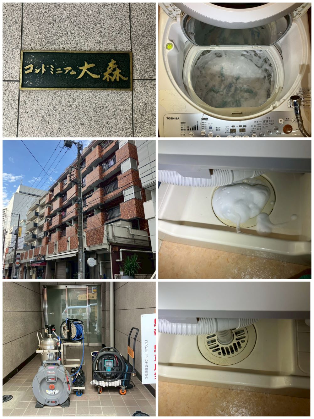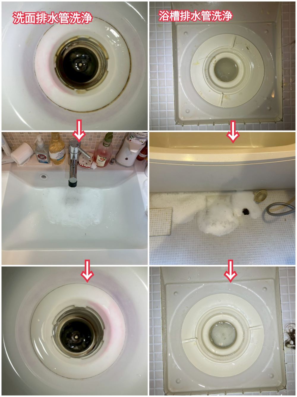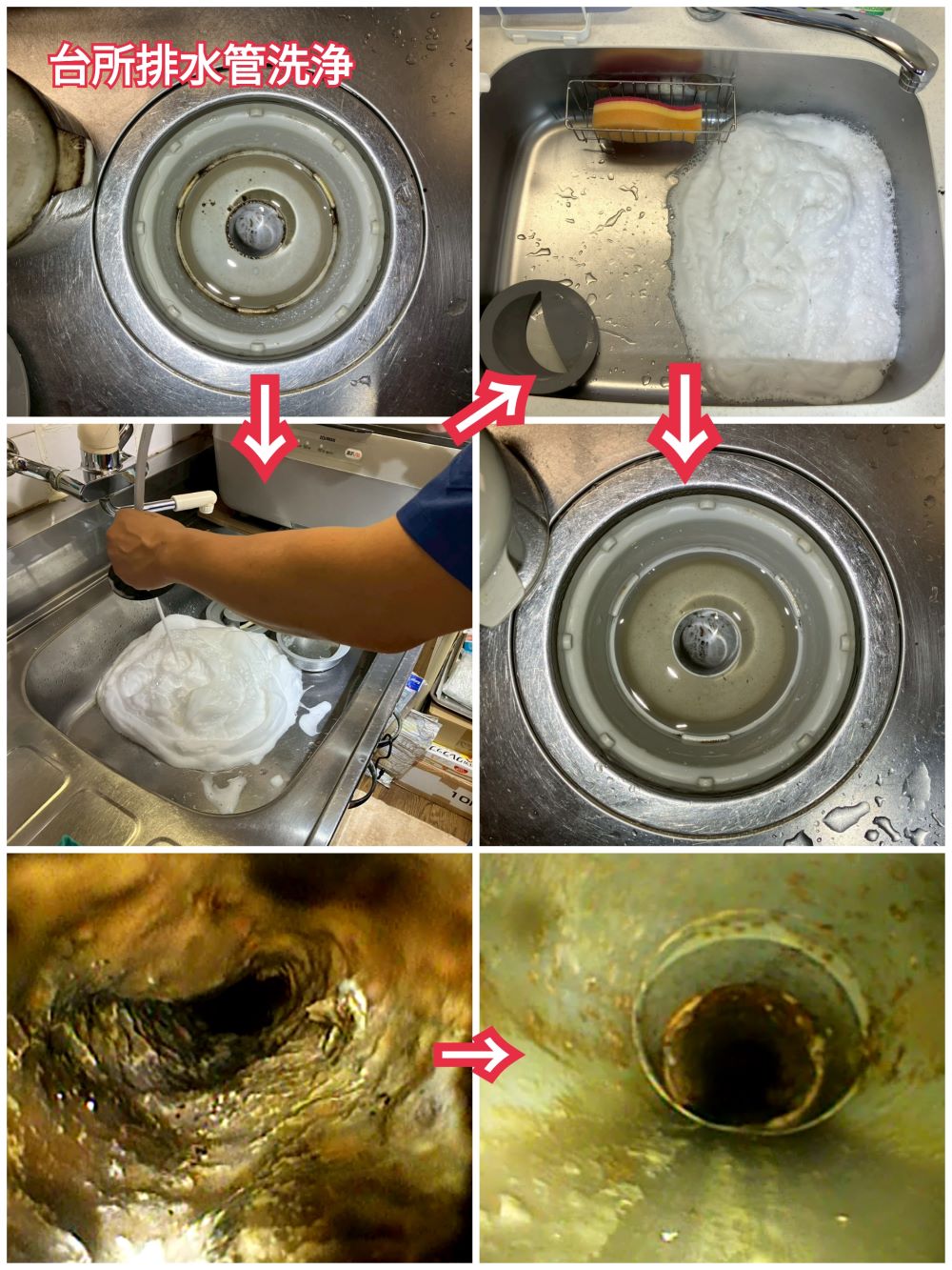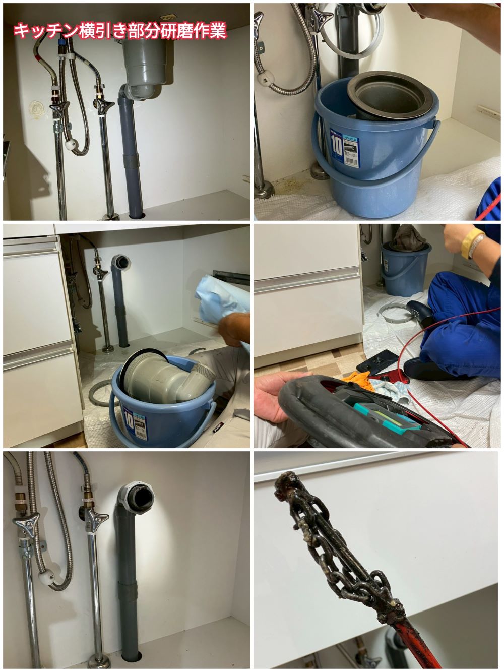 排水管低圧ムース洗浄(台所・洗濯・浴槽・洗面所の各排水管の4点洗浄)、共用部台所排水管サビコブ除去