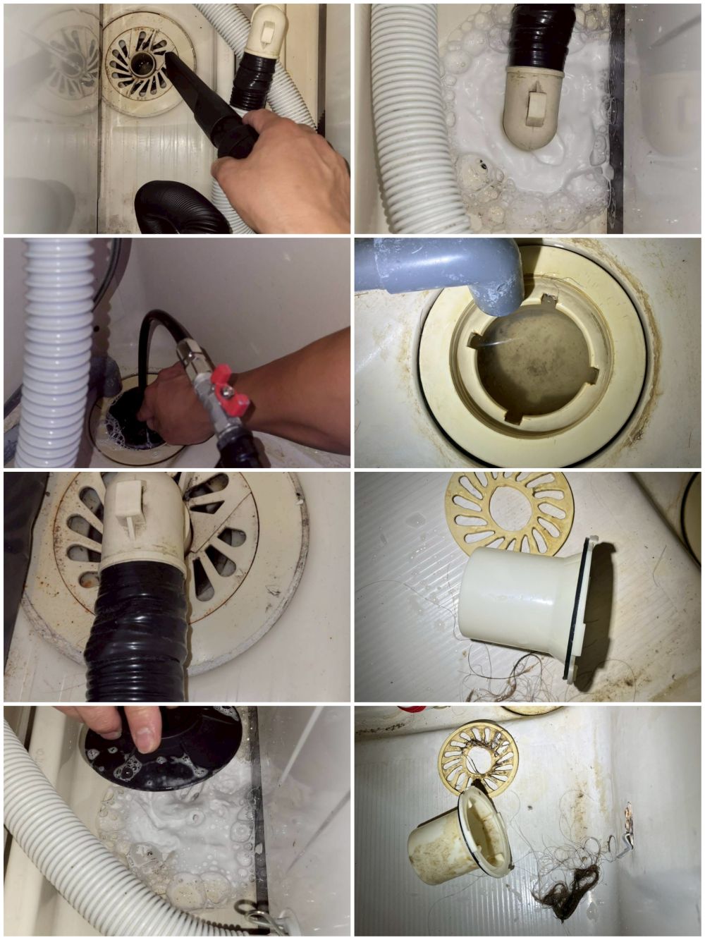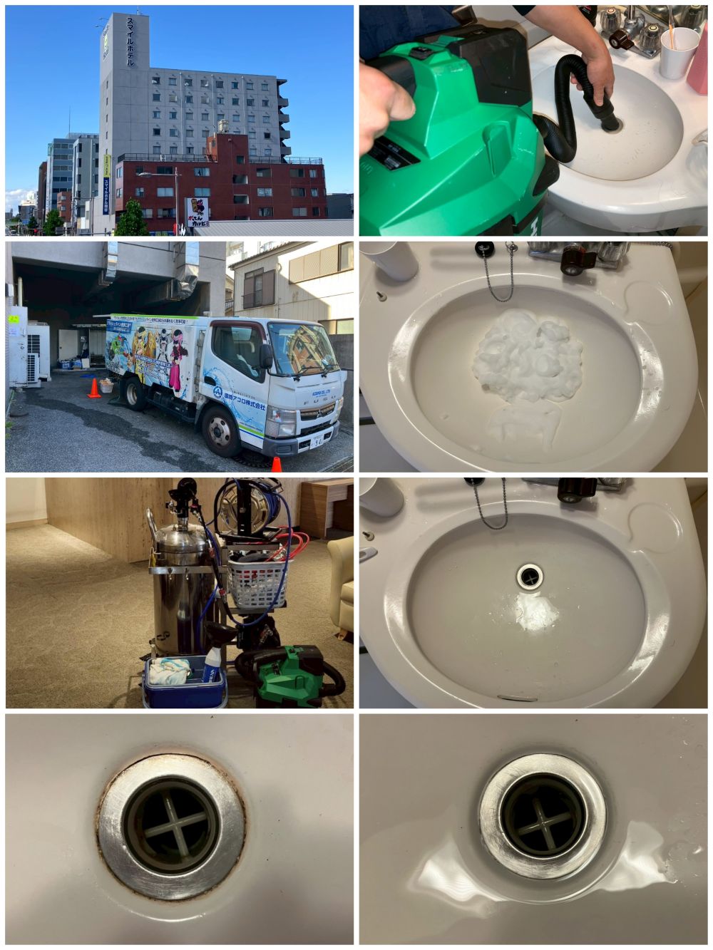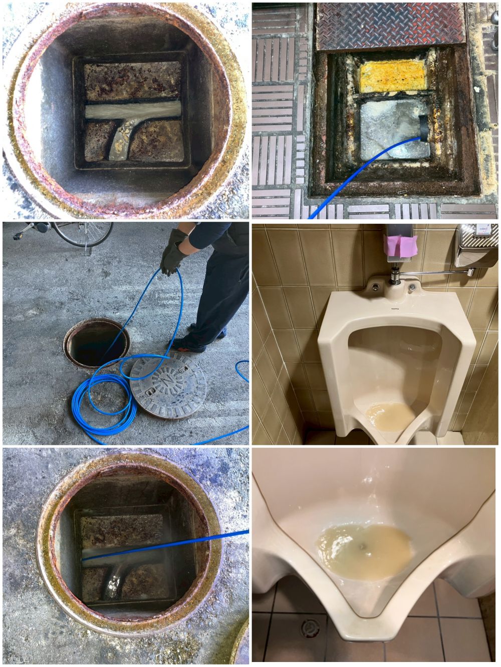 排水管低圧ムース洗浄(台所・洗濯・浴槽・洗面所の各排水管の4点洗浄)、1F小便器尿石除去